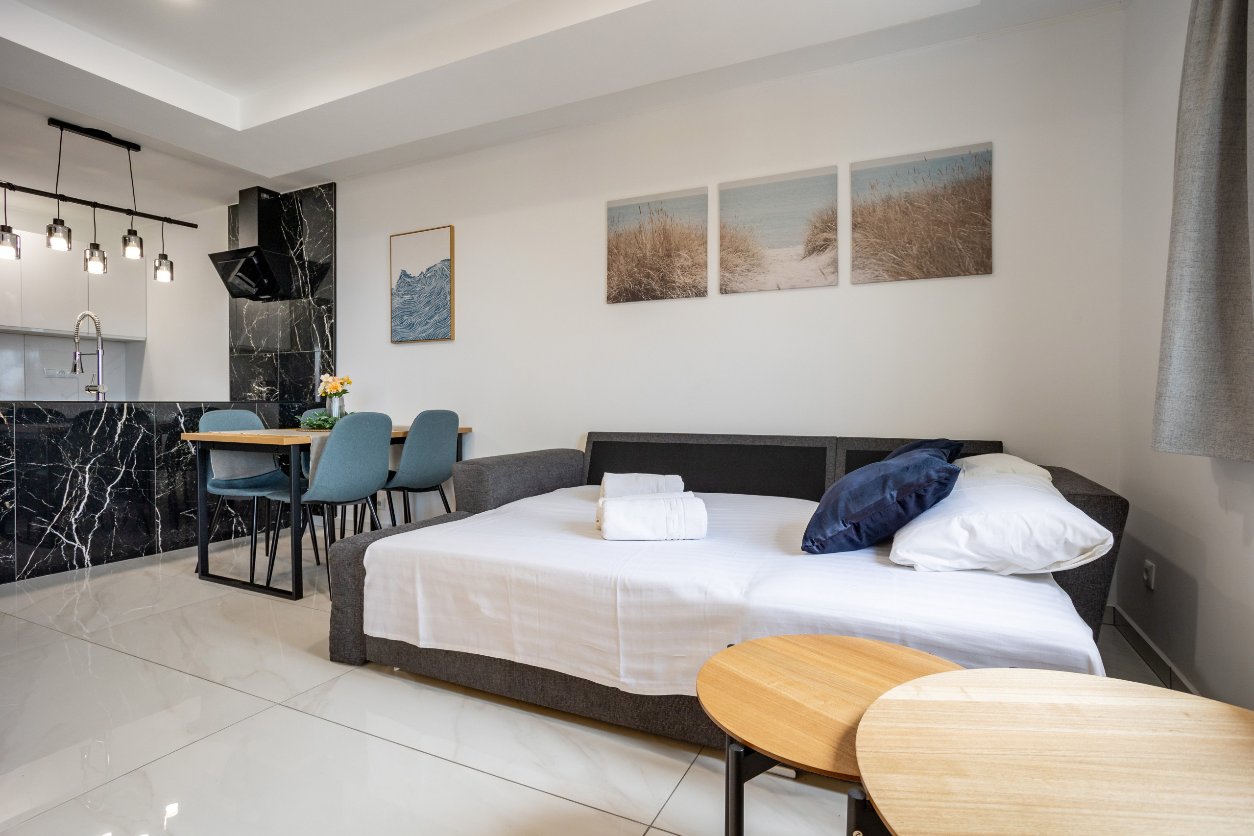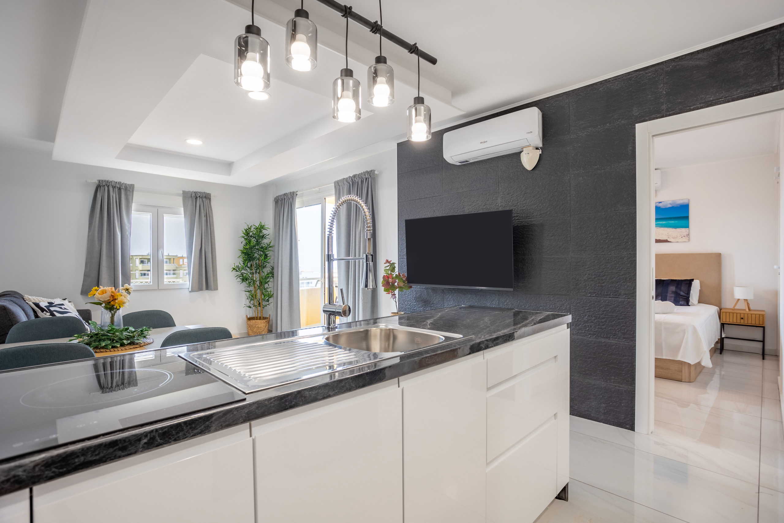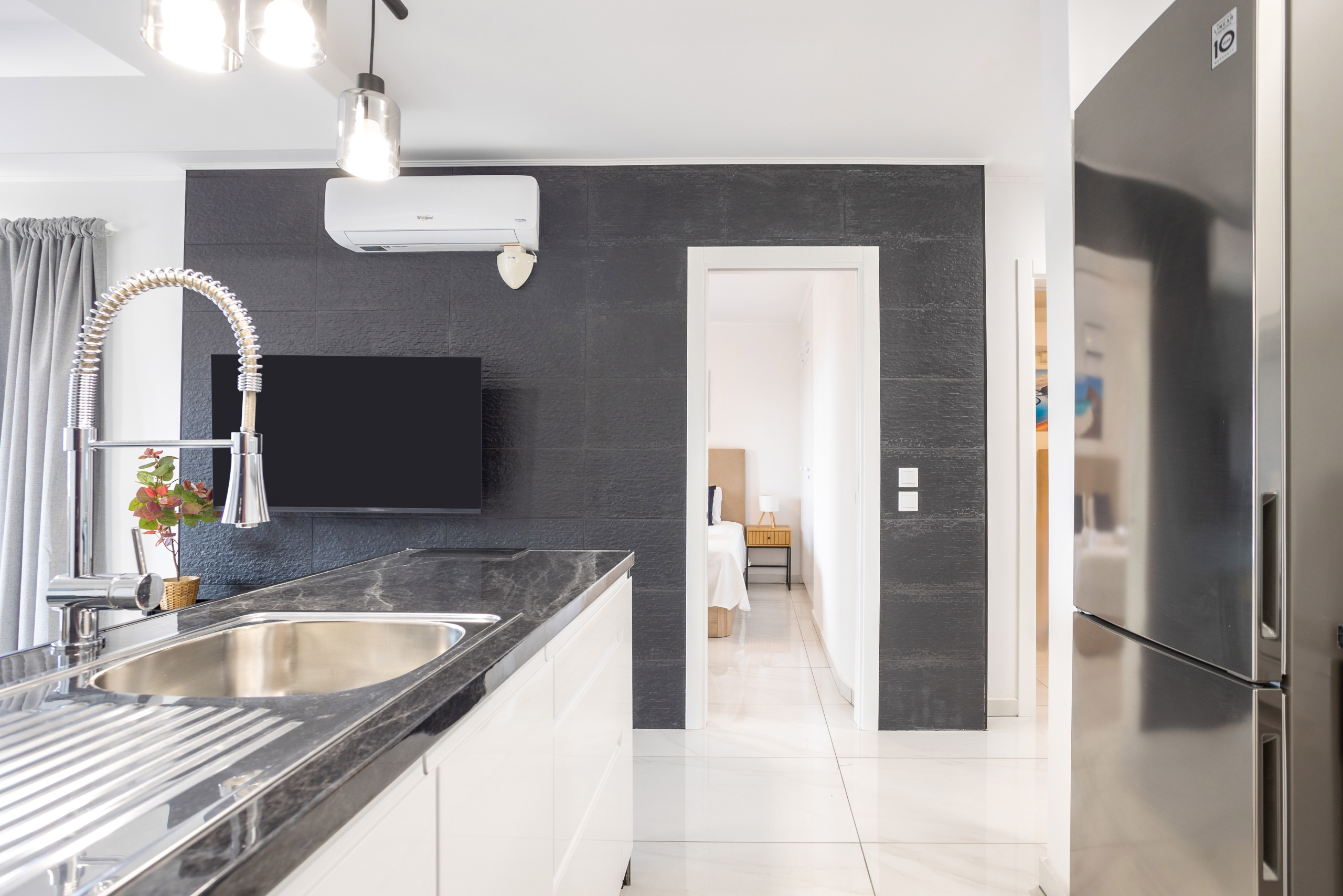 In the hotplate of glass ceramics open plan kitchen, refrigerator, microwave, oven, freezer, dishwasher, dishes/cutlery, kitchen utensils, coffee machine, toaster and kettle are provided.