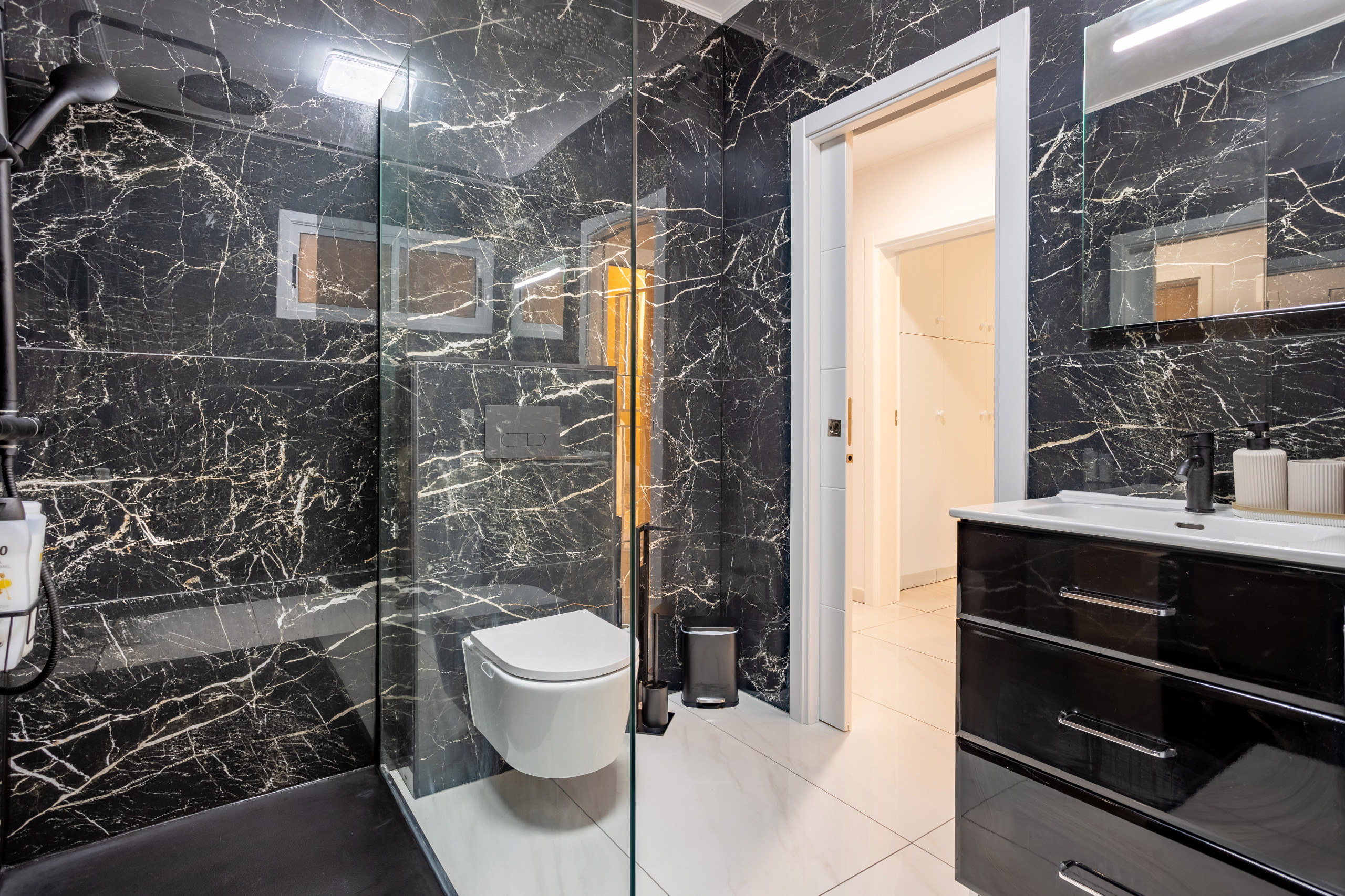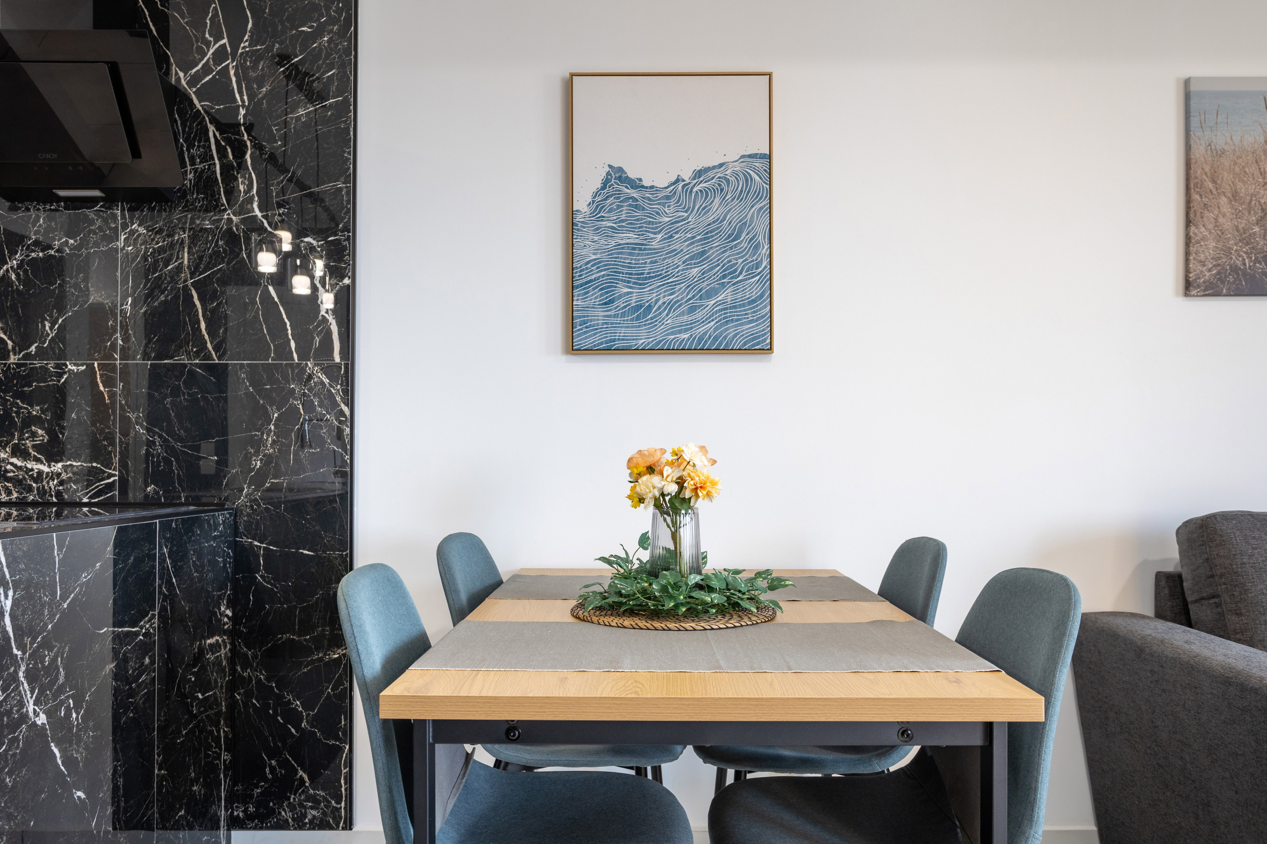 The apartment is nice, is modern, and is 72 m². It has views of waterfront and the mountain.